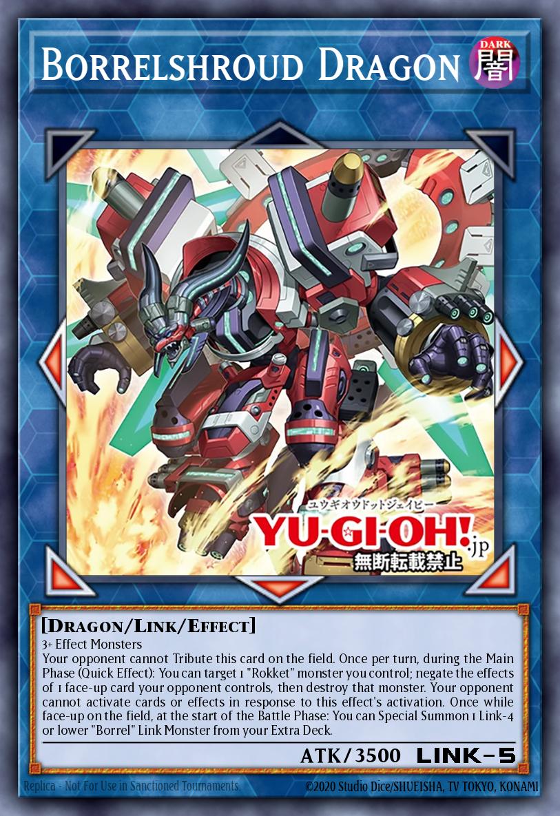 3+ Effect Monsters Your opponent cannot Tribute this card on the field. Once per turn, during the Main Phase (Quick Effect): You can target 1 "Rokket" monster you control; negate the effects of 1 face-up card your opponent controls, then destroy that monster. Your opponent cannot activate cards or effects in response to this effect's activation. Once while face-up on the field, at the start of the Battle Phase: You can Special Summon 1 Link-4 or lower "Borrel" Link Monster from your Extra Deck.