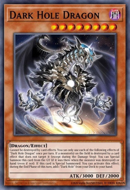 Cannot be destroyed by card effects. You can only use each of the following effects of "Dark Hole Dragon" once per turn. If a monster(s) on the field is destroyed by a card effect that does not target it (except during the Damage Step): You can Special Summon this card from the GY (if it was there when the monster was destroyed) or hand (even if not). If this card is Special Summoned: You can activate this effect; during the End Phase of this turn, add 1 "Dark Hole" from your Deck to your hand.