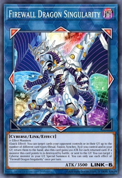 3+ Effect Monsters (Quick Effect): You can target cards your opponent controls or in their GY up to the number of different card types (Ritual, Fusion, Synchro, Xyz) you control and in your GY; return them to the hand, also this card gains 500 ATK for each returned card. If a monster this card points to is destroyed by battle, or sent to the GY: You can target 1 Cyberse monster in your GY; Special Summon it. You can only use each effect of "Firewall Dragon Singularity" once per turn.
