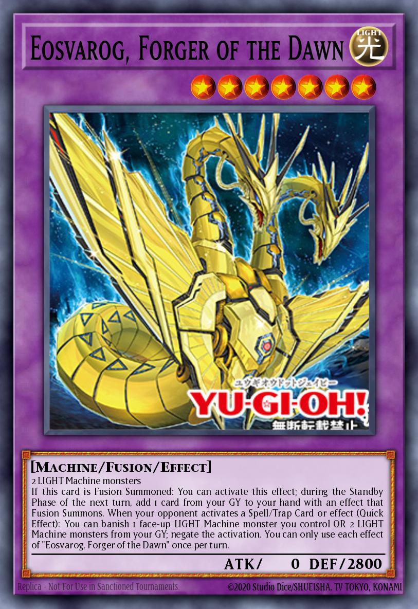 Nếu lá bài này được Triệu hồi Fusion: Bạn có thể kích hoạt hiệu ứng này; trong Standby Phase của lượt tiếp theo, thêm 1 lá bài từ Mộ của bạn lên tay bạn, với hiệu ứng Triệu hồi Fusion một quái thú. Khi đối thủ của bạn kích hoạt một Lá bài Phép/Bẫy hoặc hiệu ứng (Hiệu ứng Nhanh): Bạn có thể loại bỏ 1 quái thú Máy móc ÁNH SÁNG ngửa mặt do bạn điều khiển hoặc 2 quái thú Máy móc ÁNH SÁNG từ Mộ của bạn; vô hiệu hoá kích hoạt. Bạn chỉ có thể sử dụng mỗi hiệu ứng của "Heosvarog the Mechanical Dawn" một lần mỗi lượt.