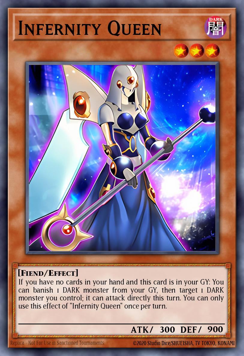 If you have no cards in your hand and this card is in your GY: You can banish 1 DARK monster from your GY, then target 1 DARK monster you control; it can attack directly this turn. You can only use this effect of "Infernity Queen" once per turn.