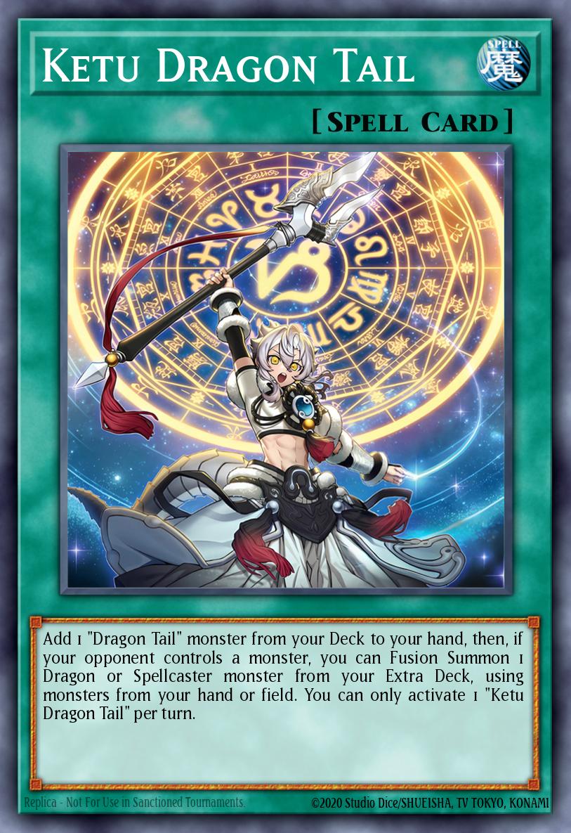 Add 1 "Dracotail" monster from your Deck to your hand, then if your opponent controls a monster, you can Fusion Summon 1 Dragon or Spellcaster monster from your Extra Deck, using monsters from your hand or field. You can only activate 1 "Ketu Dracotail" per turn.