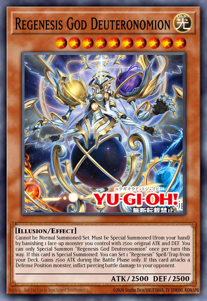 Không thể Triệu hồi/Úp thông thường. Phải Triệu hồi đặc biệt (từ tay bạn) bằng cách loại bỏ 1 quái thú ngửa mặt mà bạn điều khiển với 2500 ATK và DEF gốc. Bạn chỉ có thể Triệu hồi đặc biệt "Regenesis Lord" một lần mỗi lượt theo cách này. Nếu lá bài này được Triệu hồi đặc biệt: Bạn có thể Úp 1 Lá bài Phép/Bẫy "Regenesis" từ Deck của bạn. Chỉ nhận được 2500 ATK trong Battle Phase. Nếu lá bài này tấn công một quái thú Thế phòng thủ, gây sát thương chiến đấu xuyên thấu cho đối thủ của bạn.
