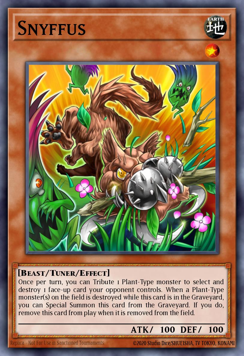 Once per turn, you can Tribute 1 Plant-Type monster to select and destroy 1 face-up card your opponent controls. When a Plant-Type monster(s) on the field is destroyed while this card is in the Graveyard, you can Special Summon this card from the Graveyard. If you do, remove this card from play when it is removed from the field.