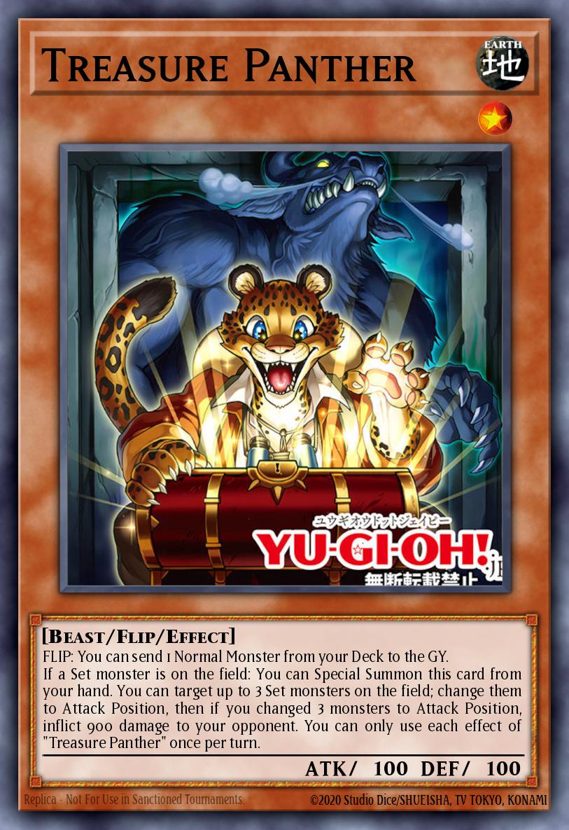 FLIP: You can send 1 Normal Monster from your Deck to the GY. If a Set monster is on the field: You can Special Summon this card from your hand. You can target up to 3 Set monsters on the field; change them to Attack Position, then if you changed 3 monsters to Attack Position, inflict 900 damage to your opponent. You can only use each effect of "Treasure Panther" once per turn.