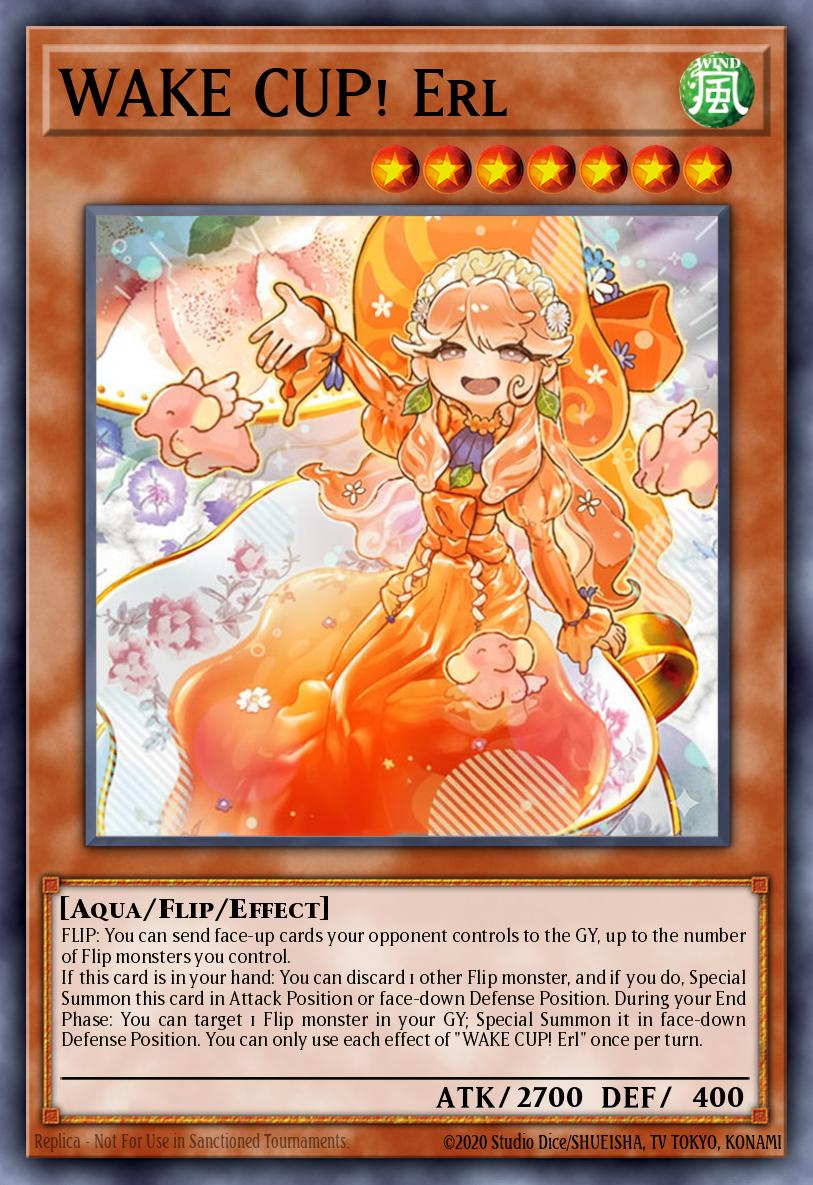 FLIP: You can send face-up cards your opponent controls to the GY, up to the number of Flip monsters you control. If this card is in your hand: You can discard 1 other Flip monster, and if you do, Special Summon this card in Attack Position or face-down Defense Position. During your End Phase: You can target 1 Flip monster in your GY; Special Summon it in face-down Defense Position. You can only use each effect of "WAKE CUP! Erl" once per turn.