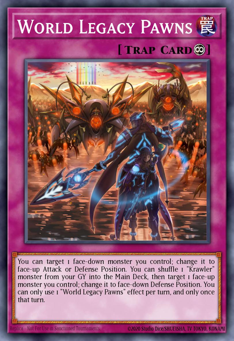 Bạn có thể chọn mục tiêu 1 quái thú úp mặt mà bạn điều khiển; thay đổi nó thành Tư thế tấn công hoặc Phòng thủ ngửa. Bạn có thể xáo trộn 1 "Krawler" từ Mộ của bạn vào Deck Chính, sau đó chọn mục tiêu 1 quái thú ngửa mà bạn điều khiển; thay đổi nó thành Tư thế phòng thủ úp xuống. Bạn chỉ có thể sử dụng 1 "World Legacy Pawns" mỗi lượt và chỉ một lần trong lượt đó.