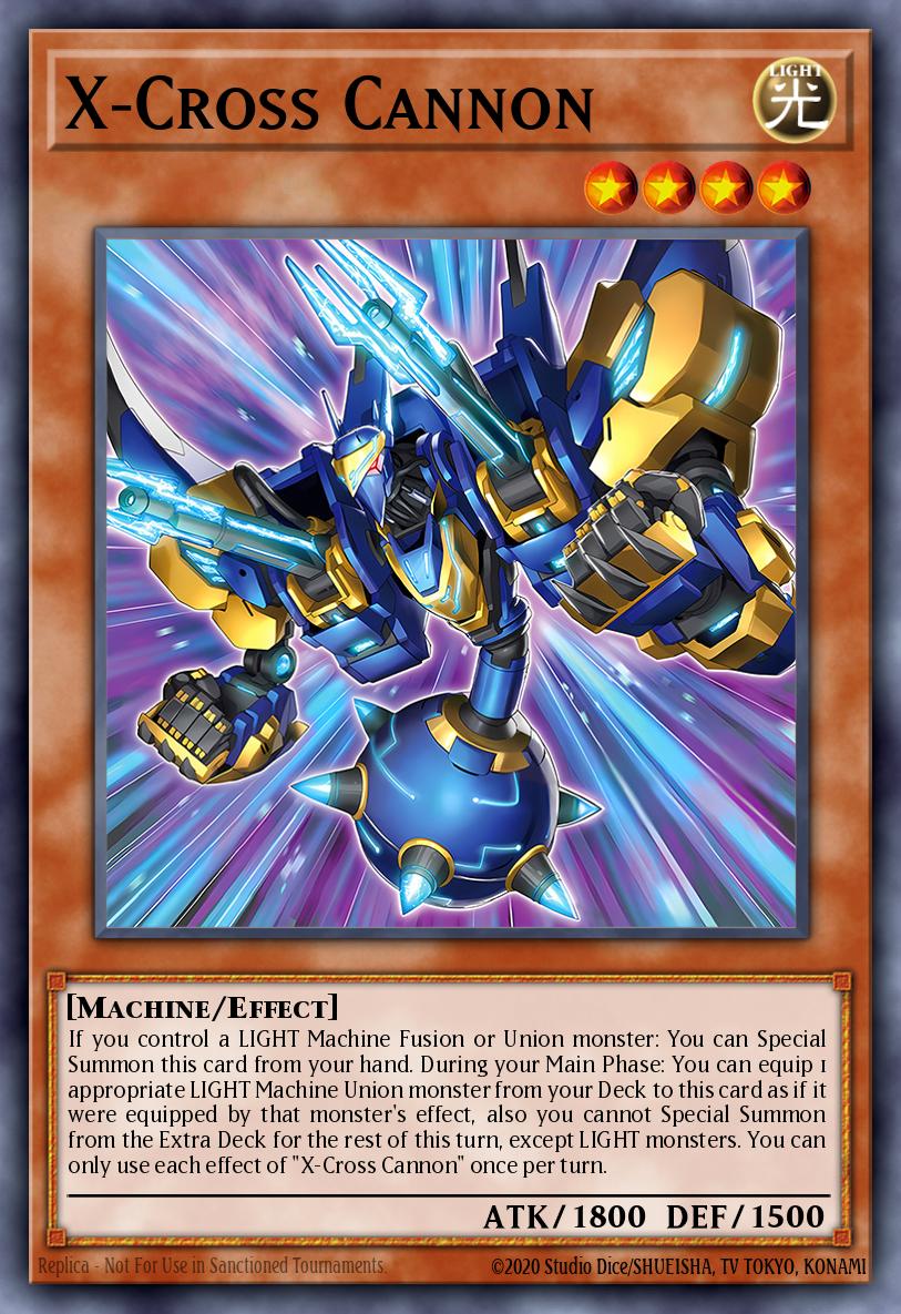 Nếu bạn điều khiển quái thú LIGHT Machine Fusion hoặc Union: Bạn có thể Triệu hồi Đặc biệt lá bài này từ tay bạn. Trong Main Phase của bạn: Bạn có thể trang bị 1 quái thú LIGHT Machine Union phù hợp từ Deck của bạn vào lá bài này như một Phép trang bị như thể nó được trang bị bởi hiệu ứng của quái thú đó, bạn cũng không thể Triệu hồi Đặc biệt từ Deck Thêm trong phần còn lại của lượt này, ngoại trừ quái thú LIGHT. Bạn chỉ có thể sử dụng mỗi hiệu ứng của "X-Cross Cannon" một lần mỗi lượt.